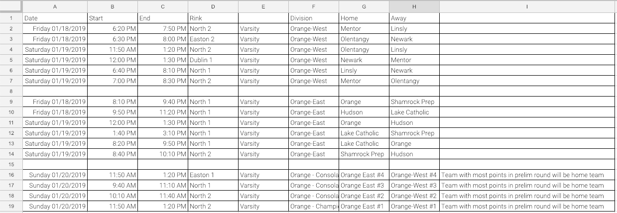 Good evening. We hope that your season is going well thus far. It is hard to believe that the 2019 Pioneer Classic Ice Hockey Tournament is only 2 weeks away. We have a 14 Varsity teams and 6 Junior Varsity teams competing in the tournament this year. The schedule has been prepared and the entire schedule will be available soon. Your team will be participating in the Varsity Orange division. There are 8 teams participating in the Orange division divided into 2 brackets (Orange-East and Orange-West). Each team will be scheduled to play 3 Round Robin Games within their bracket. Teams will be matched up with the team in the opposite bracket (Orange-East vs. Orange-West) finishing in the same place for the Sunday championship and consolation games (1st place in Orange-East will play 1st place in Orange-West for the Championship, and 2nd place in Orange-East will play 2nd place in Orange-West, 3rd place in Orange-East will play 3rd place in Orange West and 4th place in Orange-East will play 4thplace Orange-West in the consolation games).