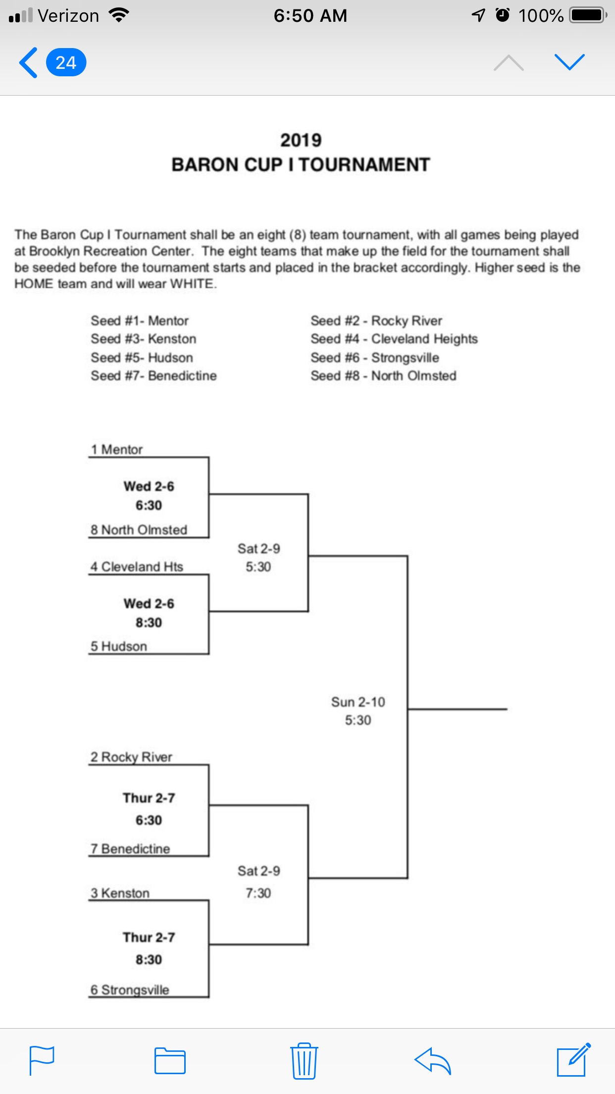 Uncategorized 2019 Baron Cup Posted by Hudson Explorers Ice Hockey on February 4, 2019 For the new people, Baron Cup is single elimination. All games are played at the Brooklyn rink. First game is Wednesday vs Cleveland Heights at 8:30pm. Share this: Click to share on X (Opens in new window) X Click to share on Facebook (Opens in new window) Facebook More Click to email a link to a friend (Opens in new window) Email Like Loading...